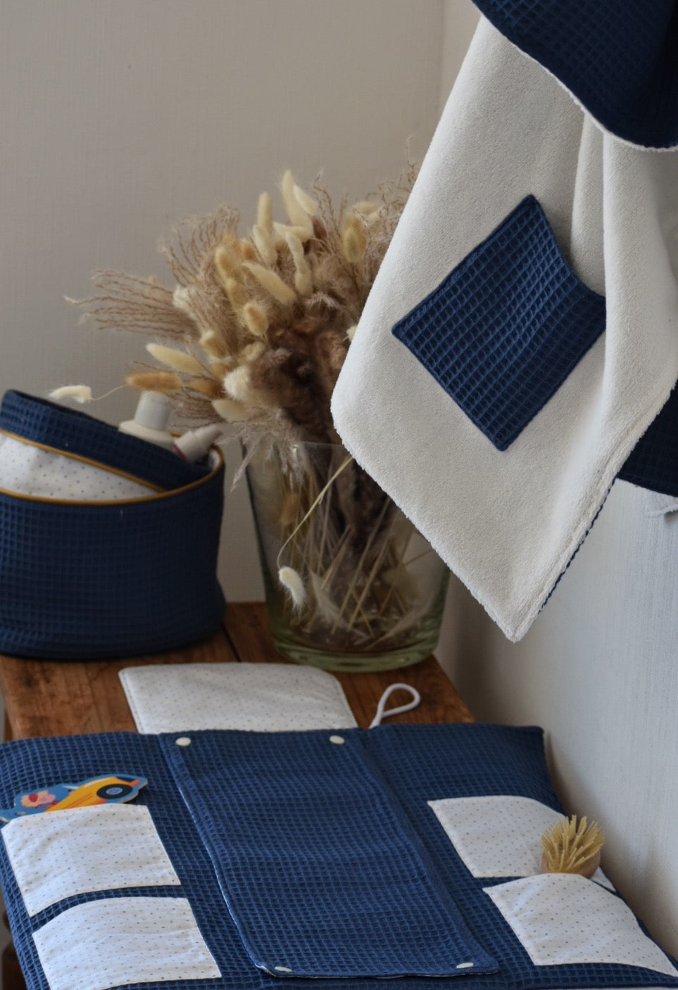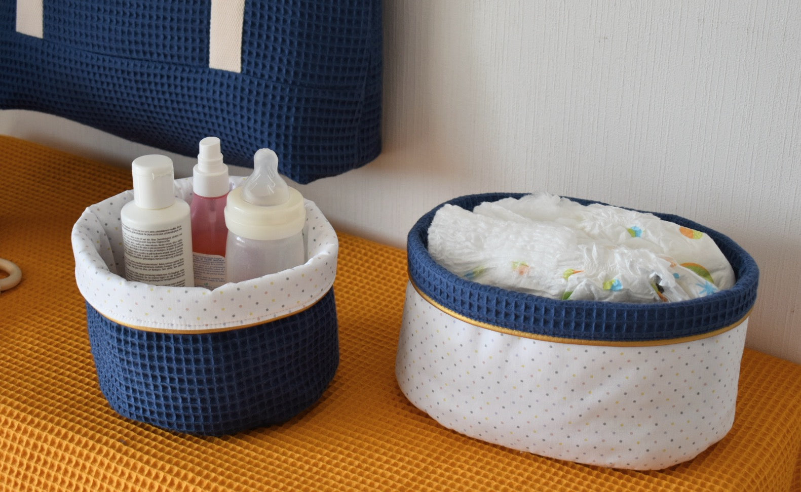 Joignez l'utile à l'agréable avec les jolies panières réversibles pour la table à langer.