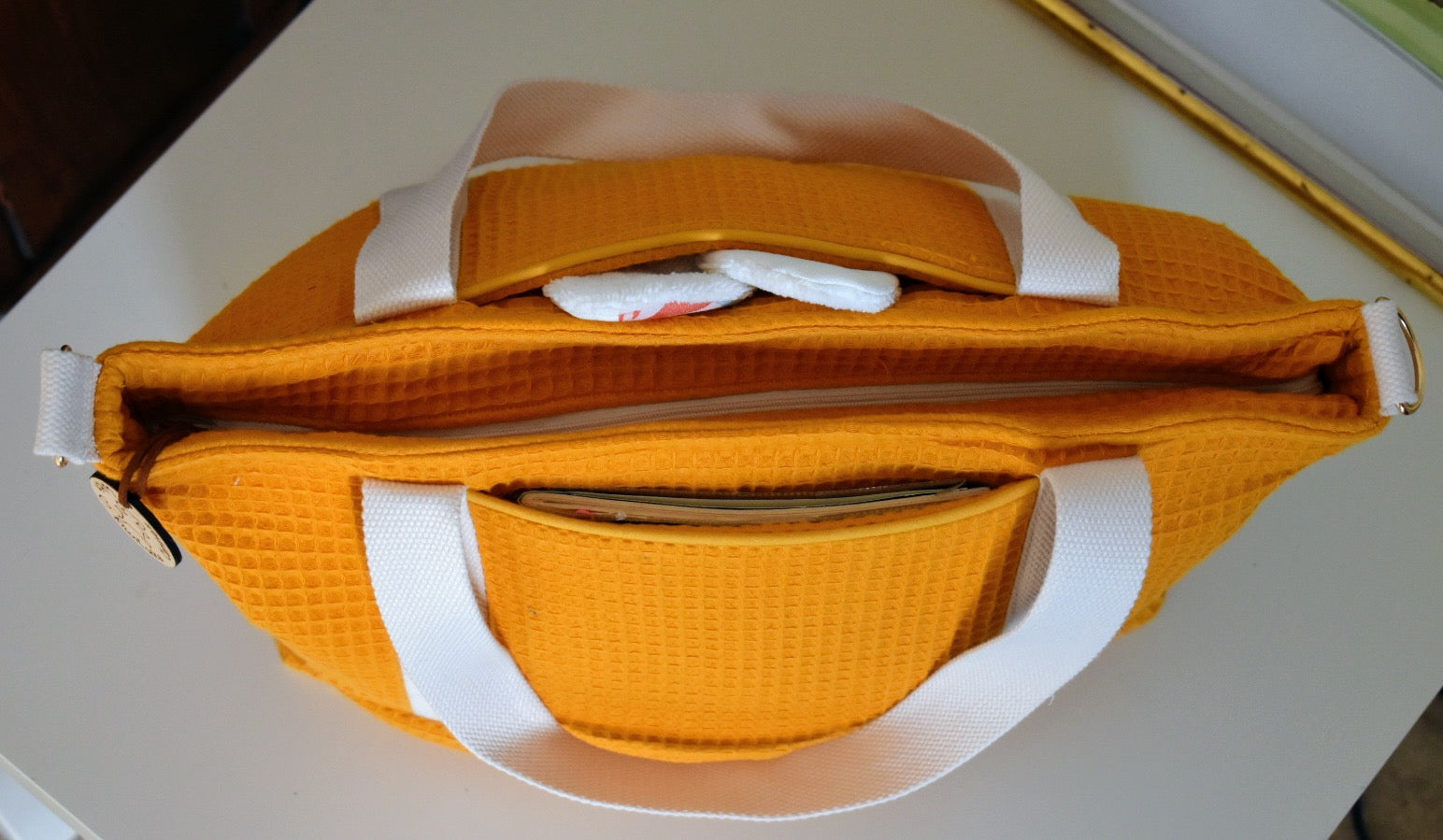 N’oubliez pas de choisir l’option en haut de page pour les poches appliquées à l’intérieur du sac : tissu fête foraine ou tissu imperméable vanille