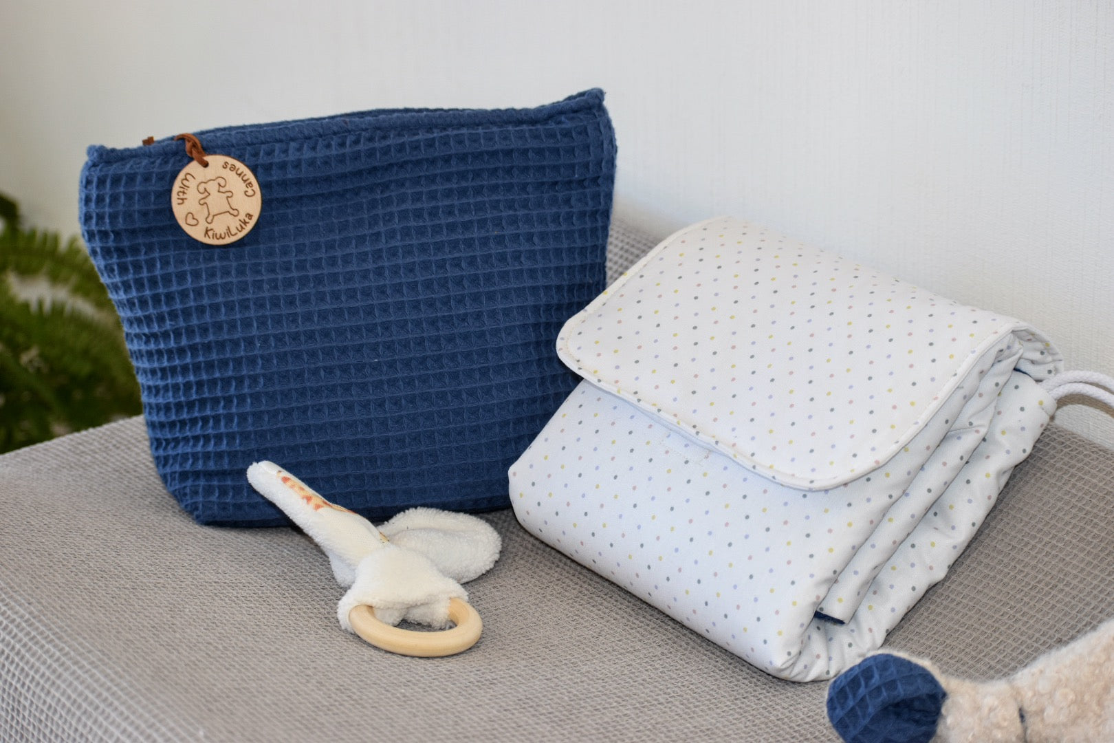- Il est fourni avec 2 serviettes de rechange pour maintenir bébé toujours au sec, un anneau de dentition en tissu assorti pour l'occuper pendant les changes et des poches pour les tubes de crème.