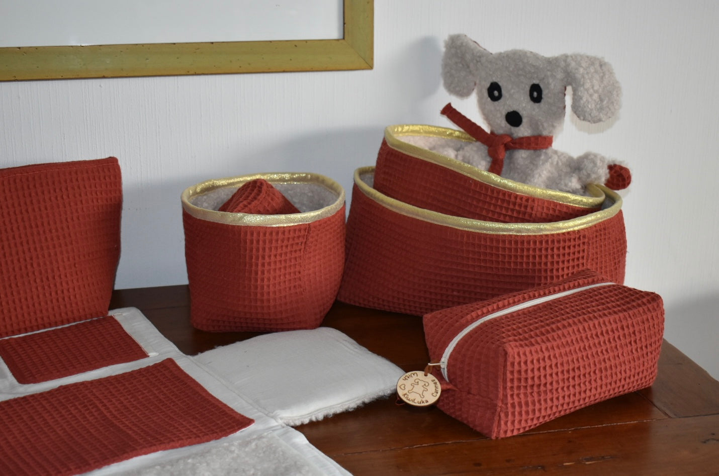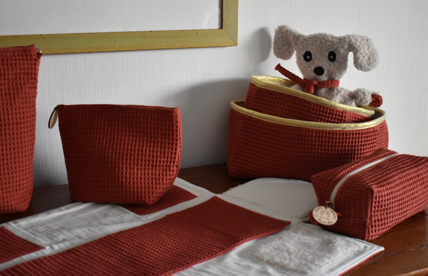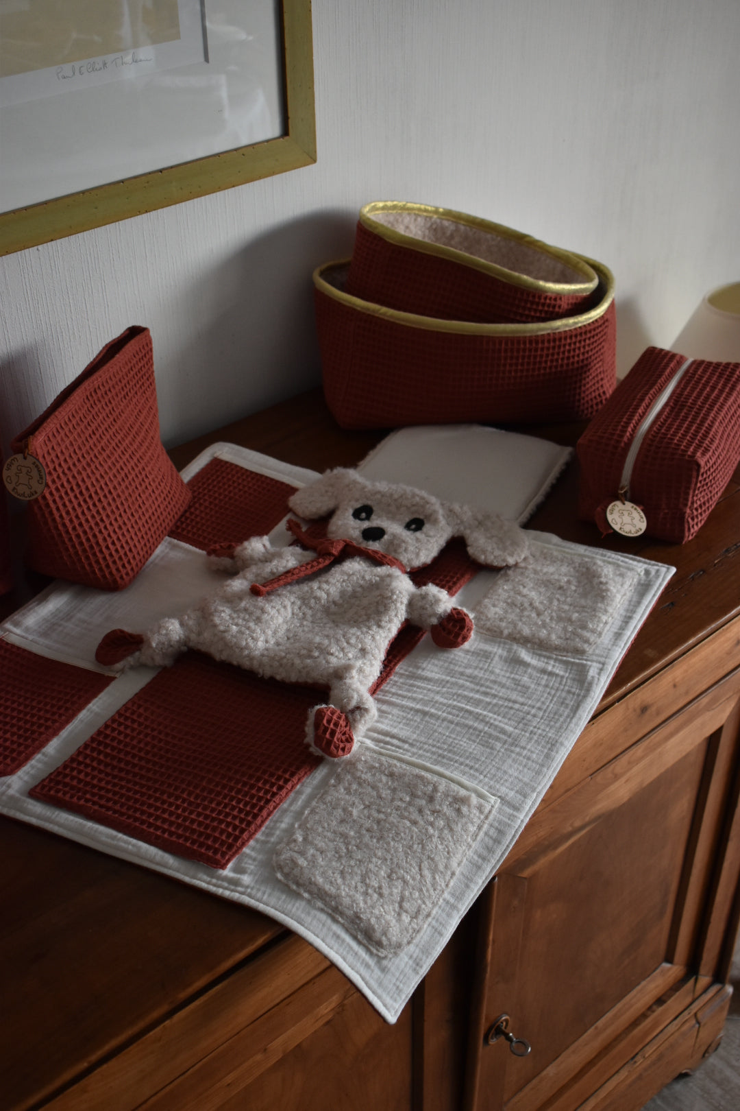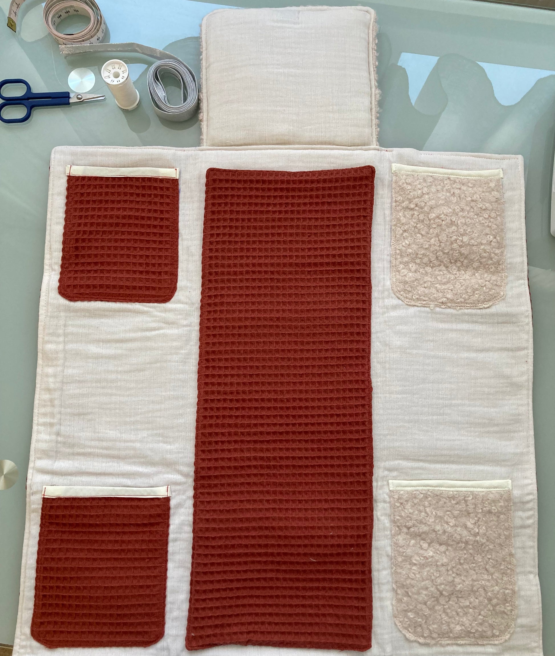 - Il est fourni avec 2 serviettes de rechange pour maintenir bébé toujours au sec, un anneau de dentition en tissu assorti pour l'occuper pendant les changes et des poches pour les tubes de crème.