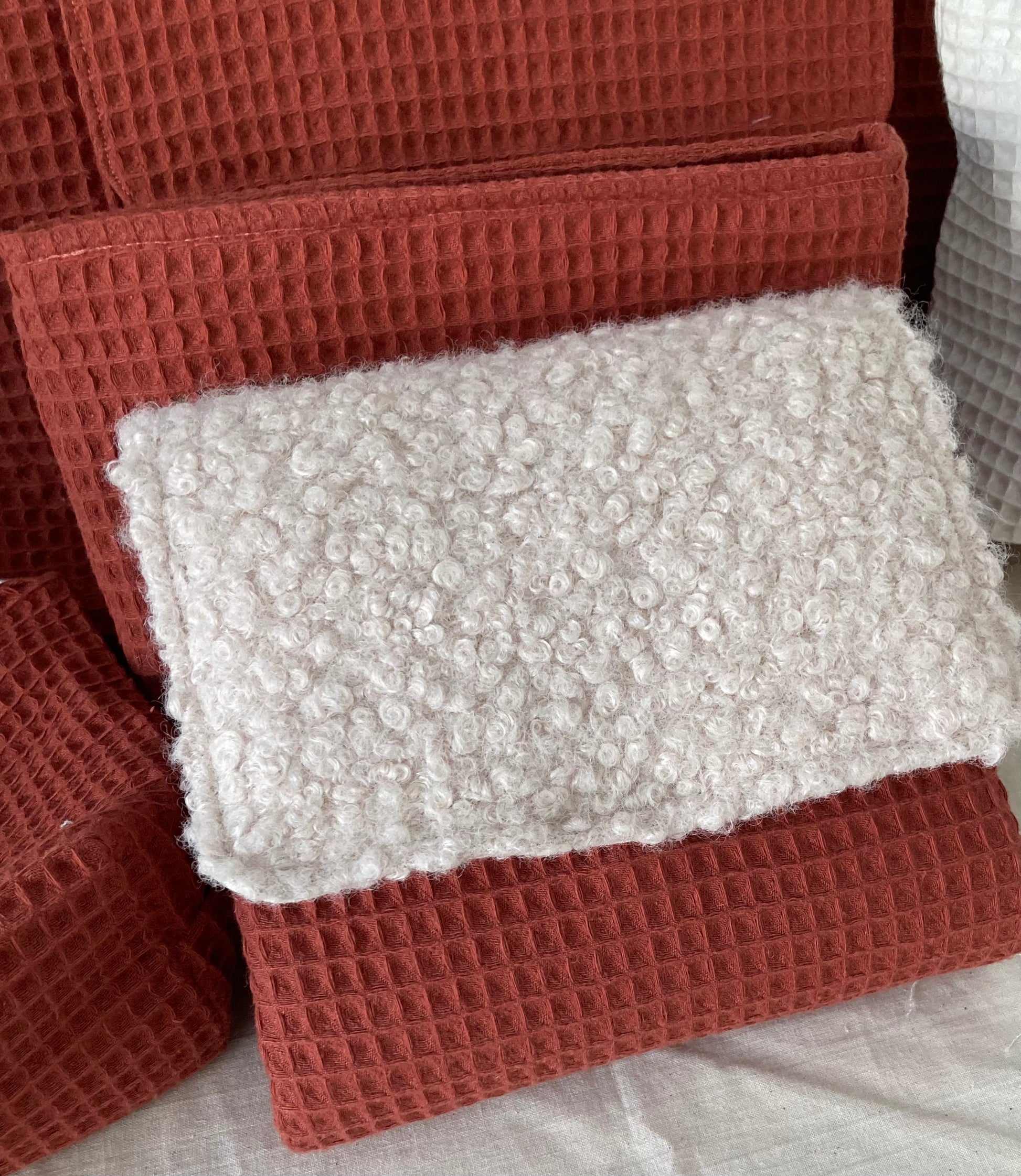 - Extérieur : nid d’abeille 100% coton Oeko Tex & sherpa 100% polyester Oeko Tex