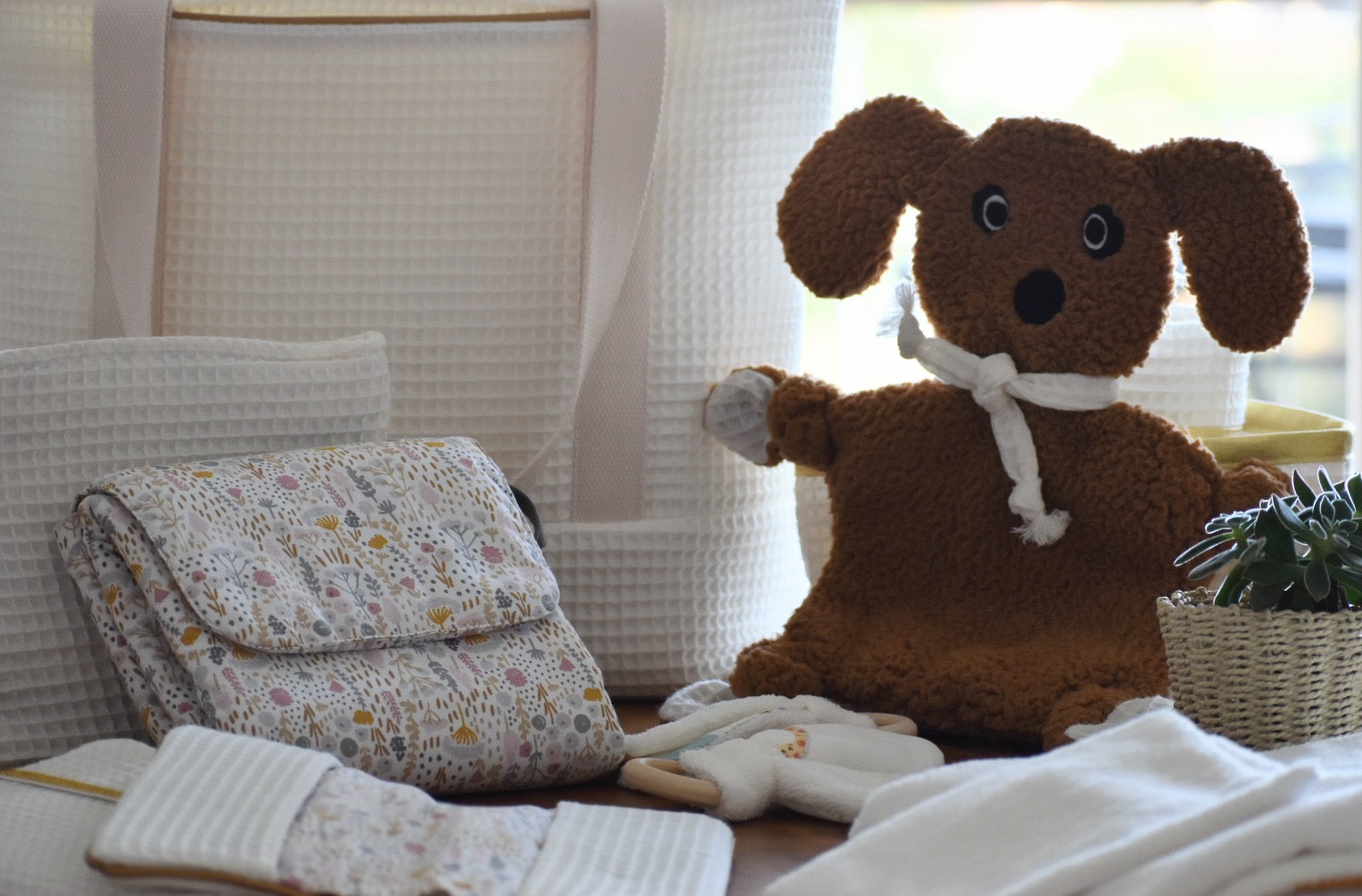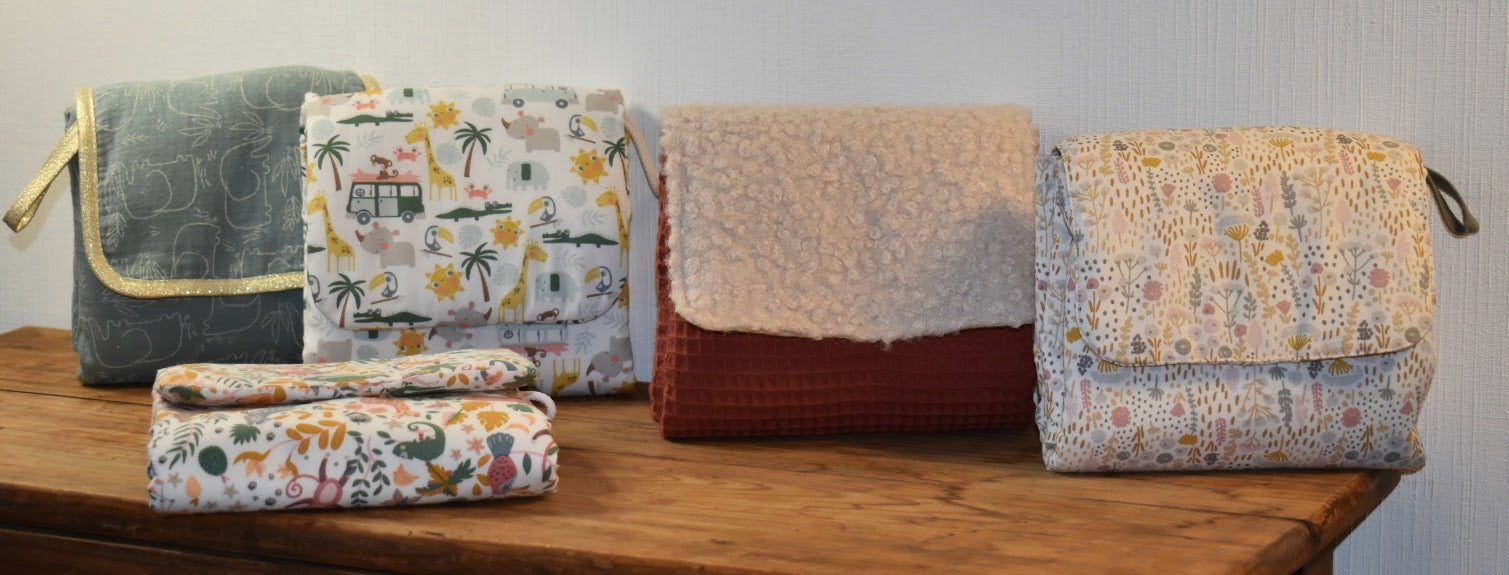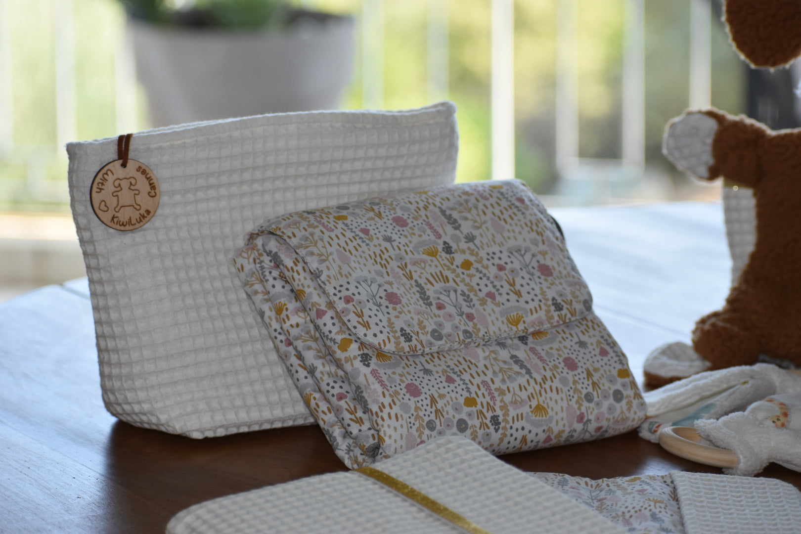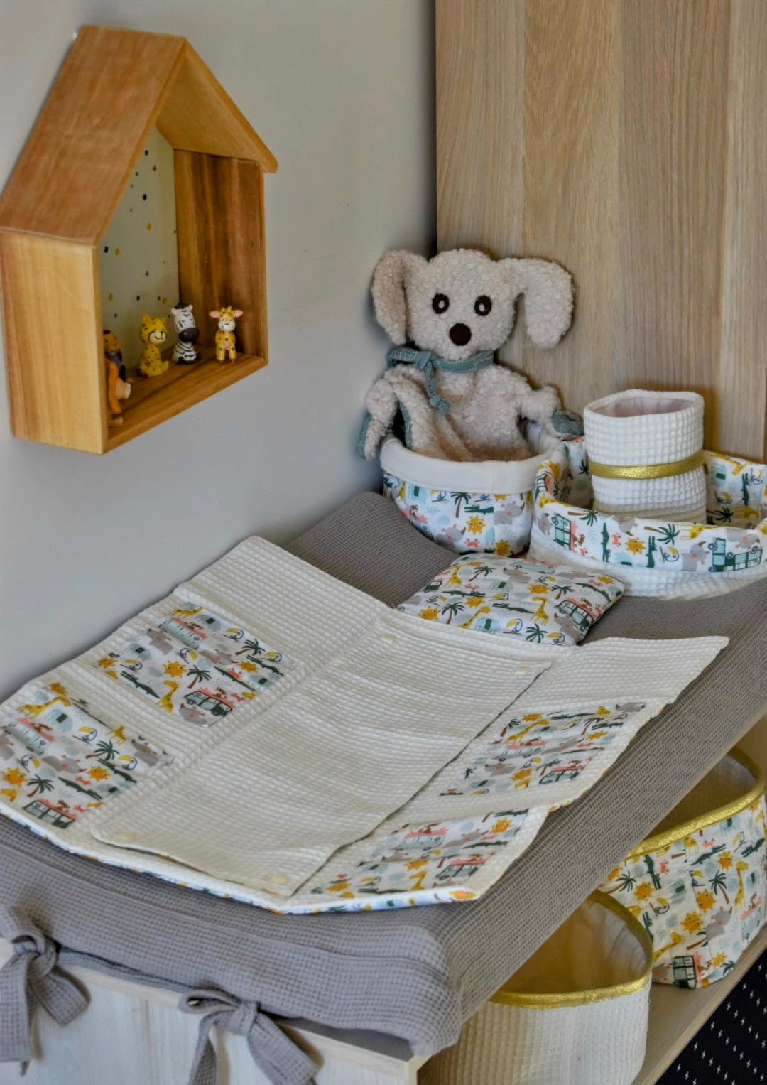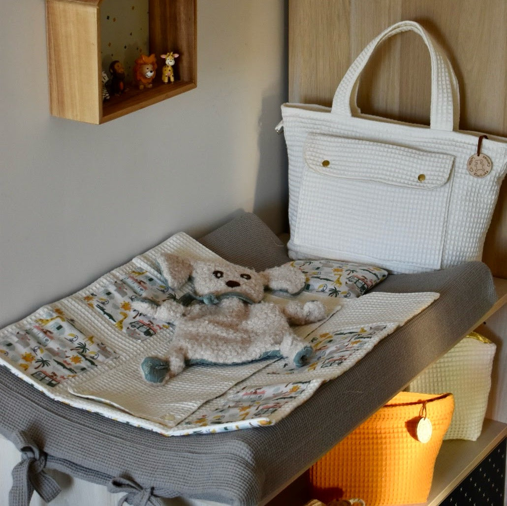 - Il est fourni avec 2 serviettes de rechange pour maintenir bébé toujours au sec, un anneau de dentition en tissu assorti pour l'occuper pendant les changes et des poches pour les tubes de crème.